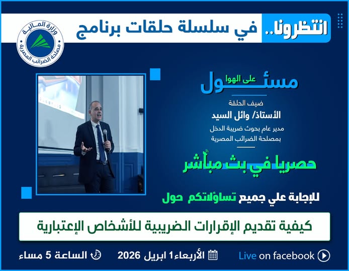 إنتظرونا..يوم الأربعاء الموافق 1 ابريل 2026 فى تمام الساعة الخامسة مساءفى حلقة جديدة من #برنامج_مسئول_على_الهواحصريا في بث مباشر علي الصفحة الرسمية لمصلحة الضرائب المصرية على الفيسبوك للإجابة علي جميع تساؤلاتكم حول" كيفية تقديم الإقرارات الضريبية للأشخاص الإعتبارية"مع ضيف الحلقةالأستاذ/ وائل السيد مدير عام ضريبة الدخل بقطاع البحوث الضريبية. |